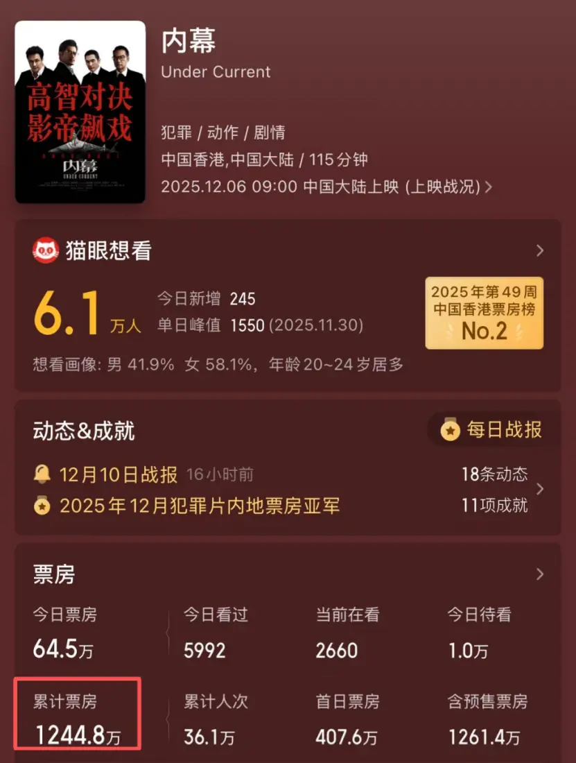 而在此之前备受期待的《得闲谨制》,也难以对它的“称霸”之路,造成什么威胁,上映6天,影片的票房也才2.2亿。