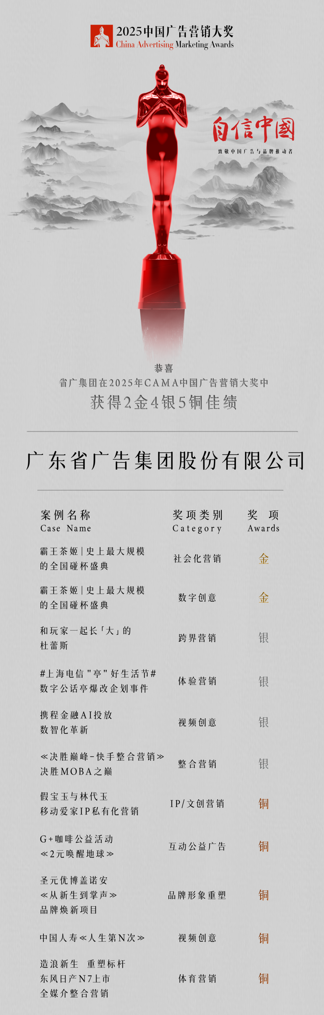 凭借突出的创意表现与全方位的营销实力,省广集团(002400)在CAMA 2025中国广告营销大奖中荣获2金4银5铜共计11项大奖,再次彰显了省广集团在行业内的领先地位与创新势能!