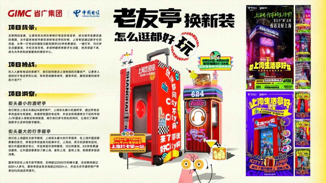为扭转消费者对于公话亭过时的印象、提升数字公话亭的场景认可度,省广集团助力上海电信创新性打造“数字公话亭潮流爆改企划”,以最大潮流行李亭+ 最小公路酒吧亭的快闪形式,结合全域媒体强势出击,吸引上海社会、市民、中外游客打卡,迅速破圈。项目曝光量超2500万;超800人参与线下活动;业务咨询量显著提升,共获3000+线上咨询及超500+现场咨询;联名商家生意增长,进店流量提升超30%。